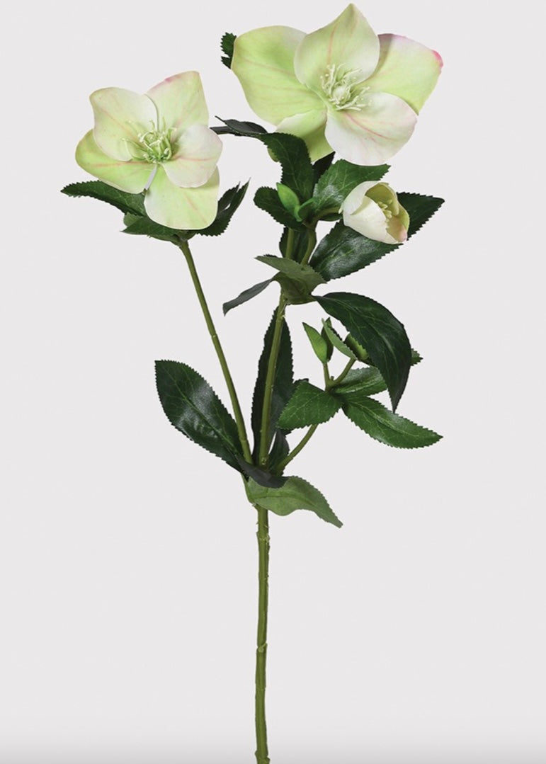 This faux pale green hellebore stem captures the quiet beauty of the real flower with remarkable realism. Delicately layered petals open in gentle shades of fresh green, with subtle tonal variations that give the bloom a natural, lifelike depth. The finely detailed centre adds an authentic touch, while the softly textured leaves and slender stem complete the look of a freshly cut hellebore.