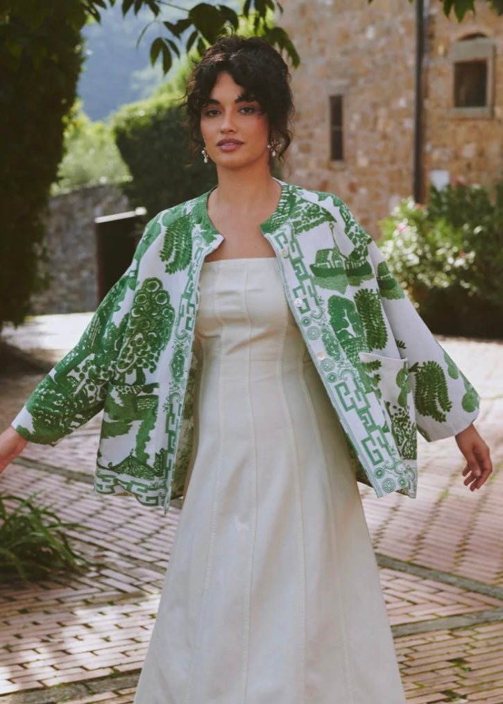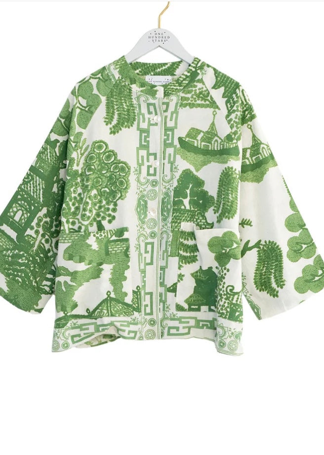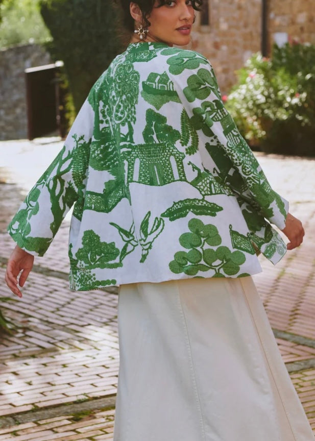 Our generously cut short cotton and linen mix jacket features a mandarin-style collar, ¾ length tapered sleeve, patch pockets and three beautiful mother-of-pearl buttons.