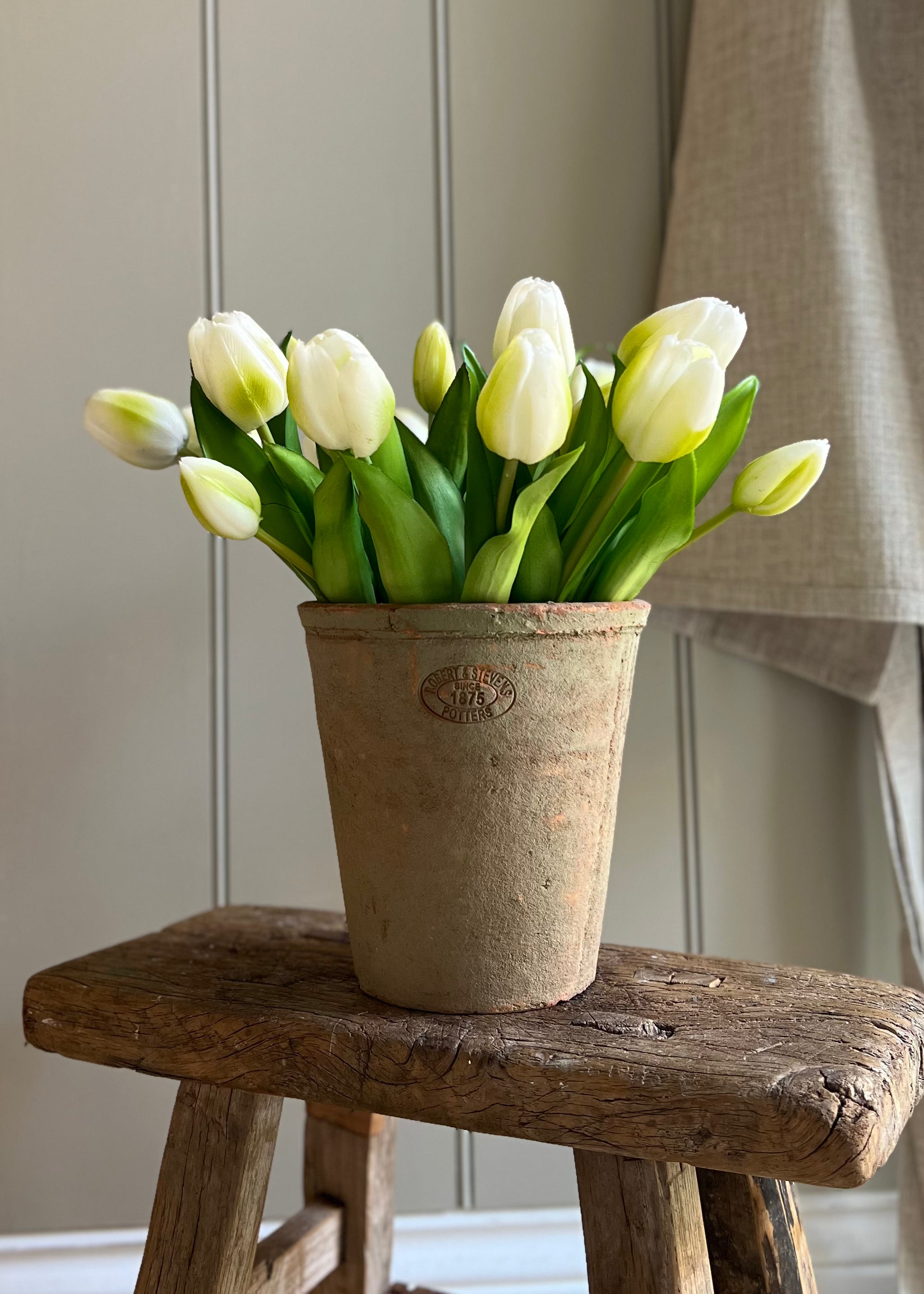 This lovely large aged terracotta pot filled with real touch faux cream tulips is perfect for Spring.