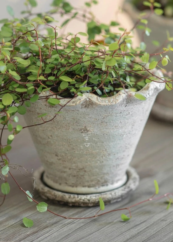 Inspired by the character of hand-formed stoneware, this Planter brings an earthy, tactile quality to your plant styling. Its gently curved profile and textured surface create a naturally warm, crafted feel that enriches both interior and garden environments. The organic aesthetic makes greenery feel expressive and grounded, whether used for large statement foliage or smaller, decorative planting. Available in two complementary sizes, this planter can be paired for layered visual interest or placed individually for subtle sculptural impact. Plus it's suitable for outdoors too. This item Includes the matching saucer.