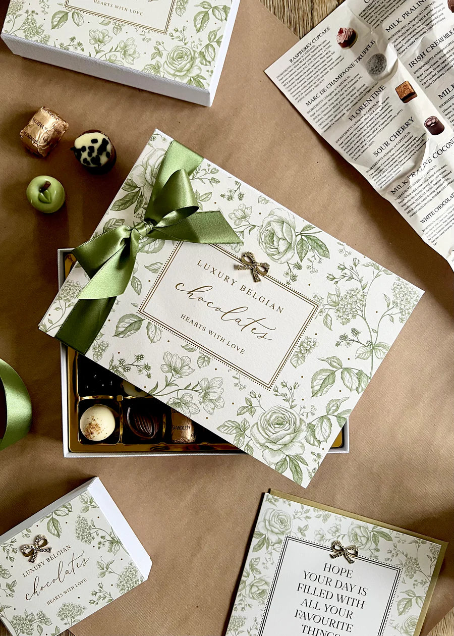 Two Beautiful Boxes Of Luxury Belgian Chocolates. Green & Cream Floral.