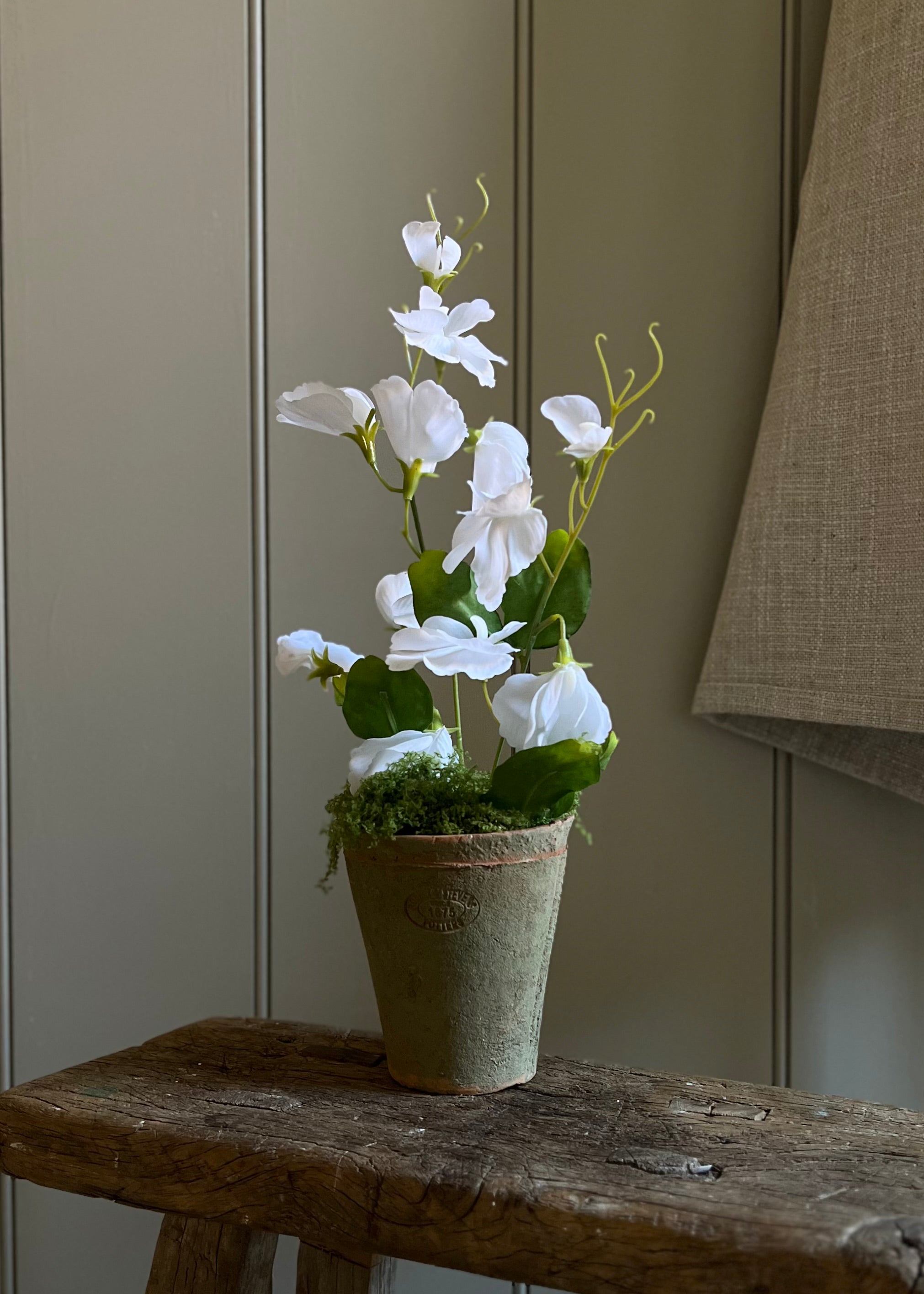 White Faux Sweet Peas In Aged Terracotta Pot With Faux Moss.