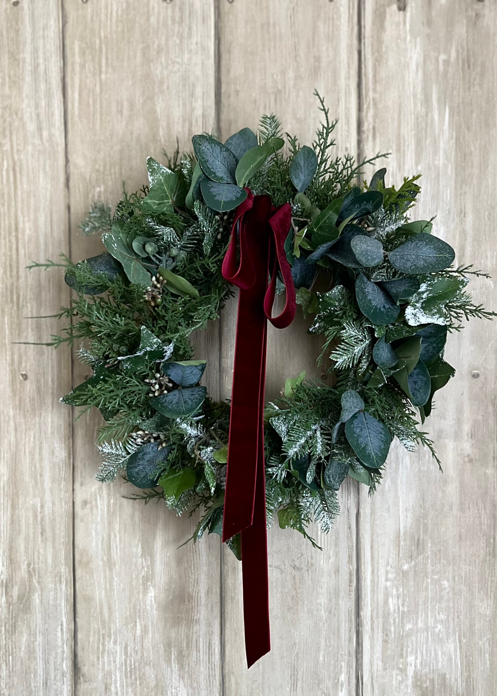 The wreath is finished with a sumptuous mulberry-coloured velvet ribbon — a luxurious flourish that complements the lush greenery and adds a classic festive charm. Perfect for hanging on your door or displaying indoors, this piece captures the magic of the season with simple, handcrafted beauty.